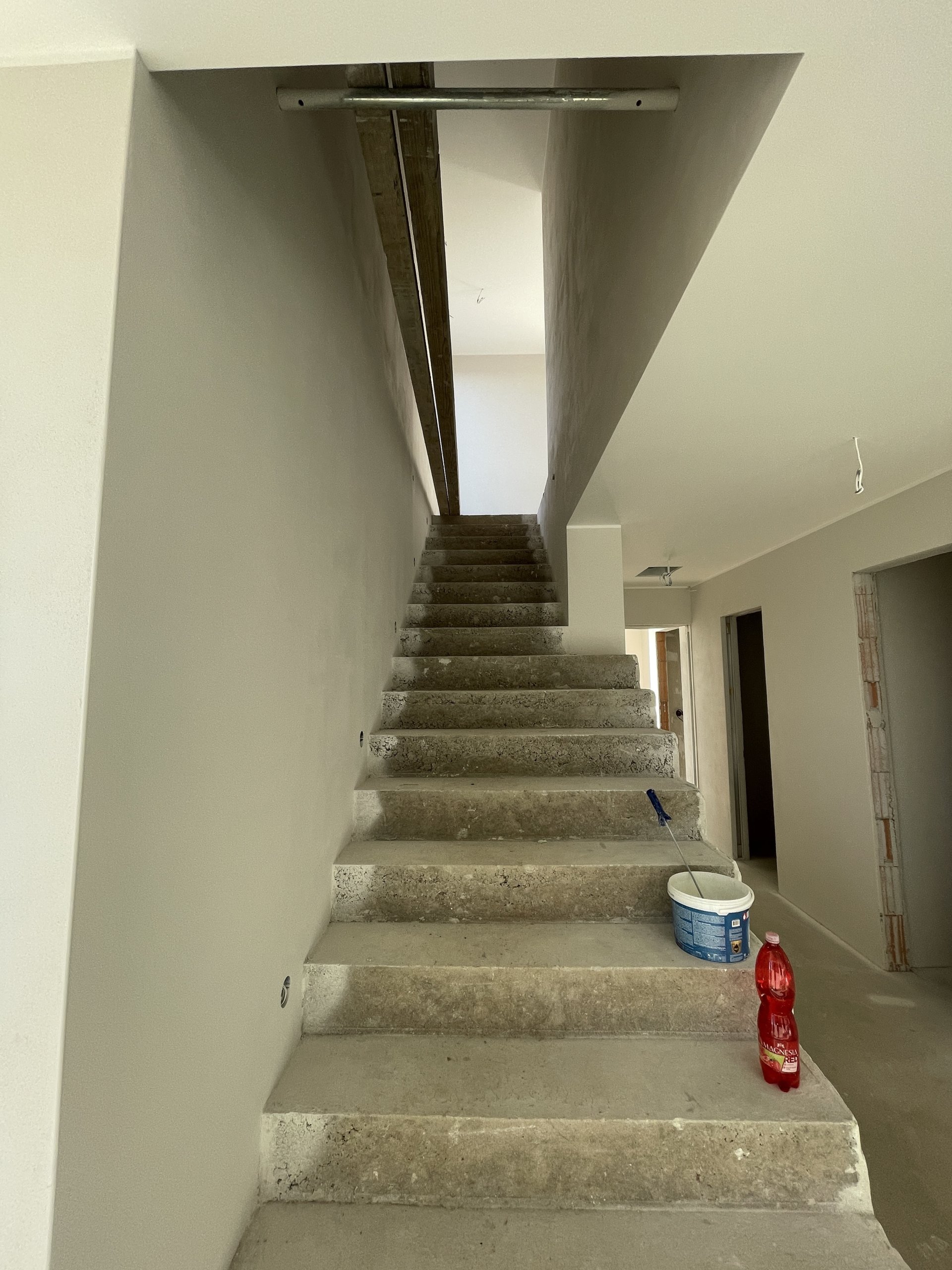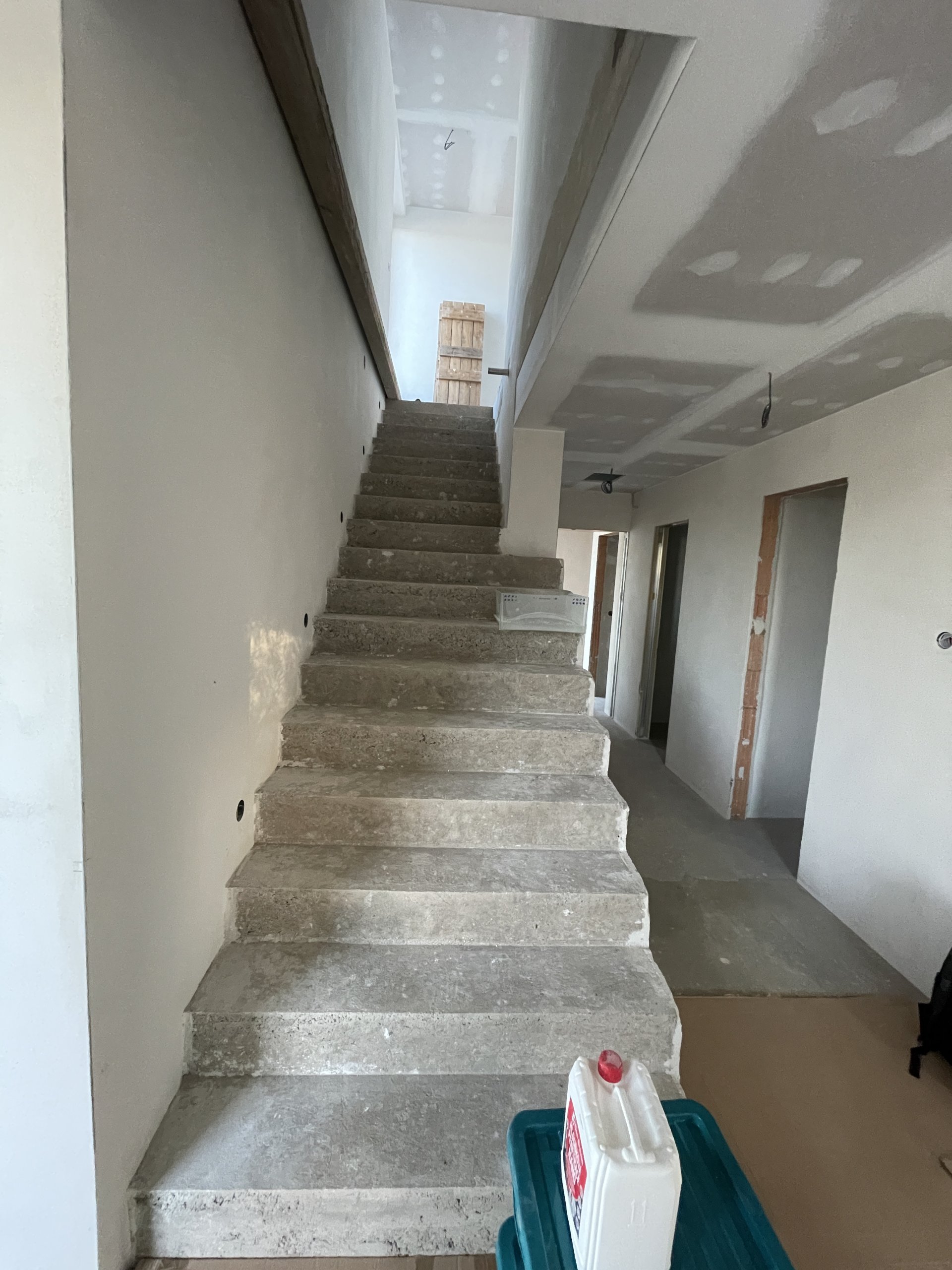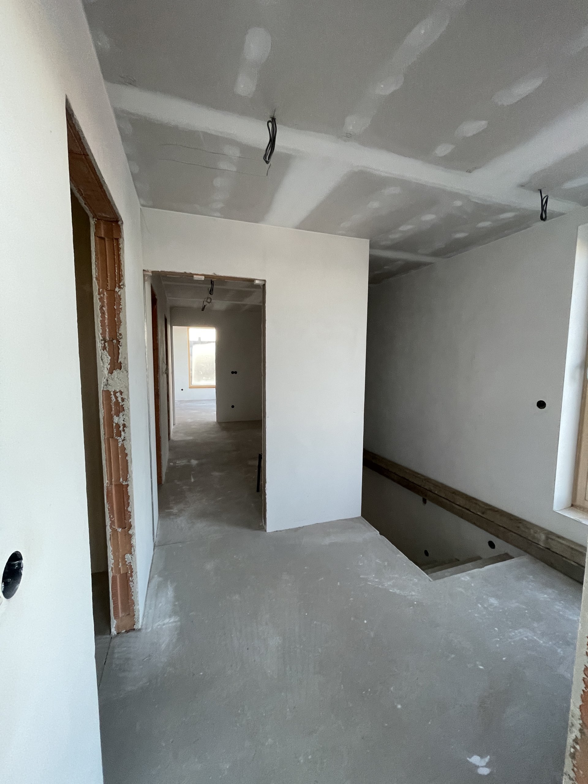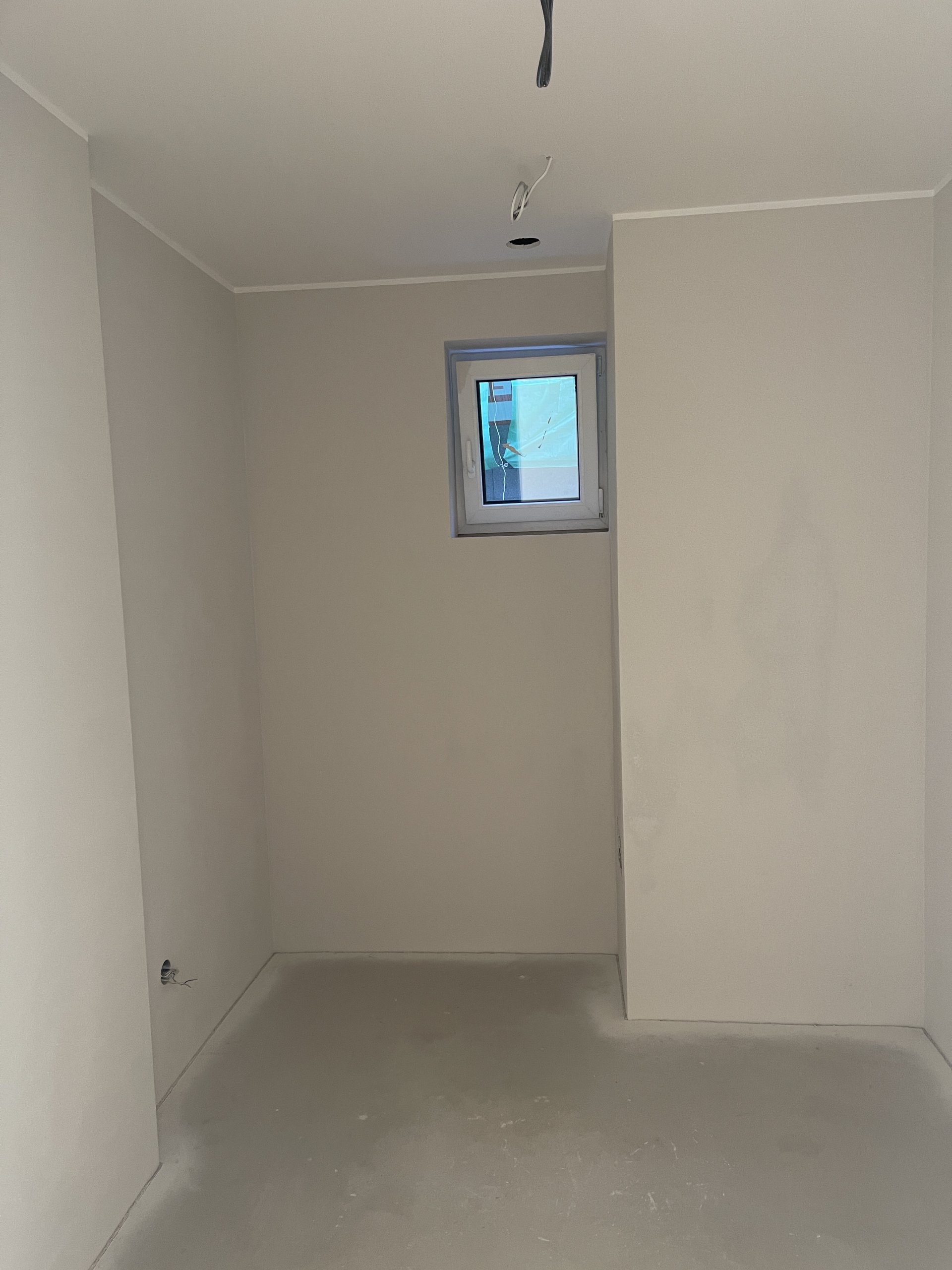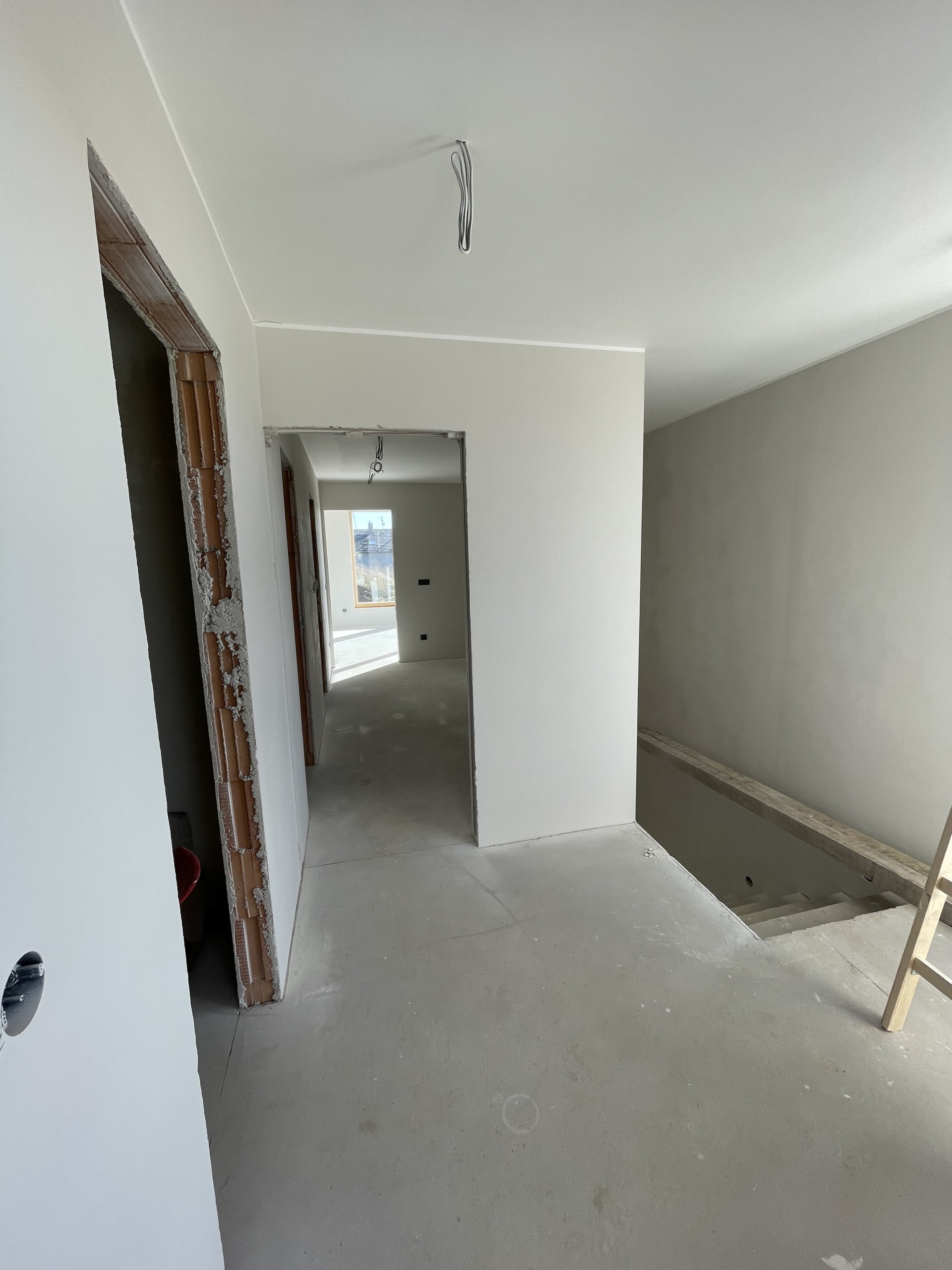 Stropy byly vymalovány bílou barvou Jupol Classic, zatímco stěny dostaly světle hnědo-béžový odstín barvou dodanou zákazníkem (značka Hornbach). Celá výmalba byla provedena Airless stříkací technikou, což zajišťuje rovnoměrný nátěr a rychlé provedení.