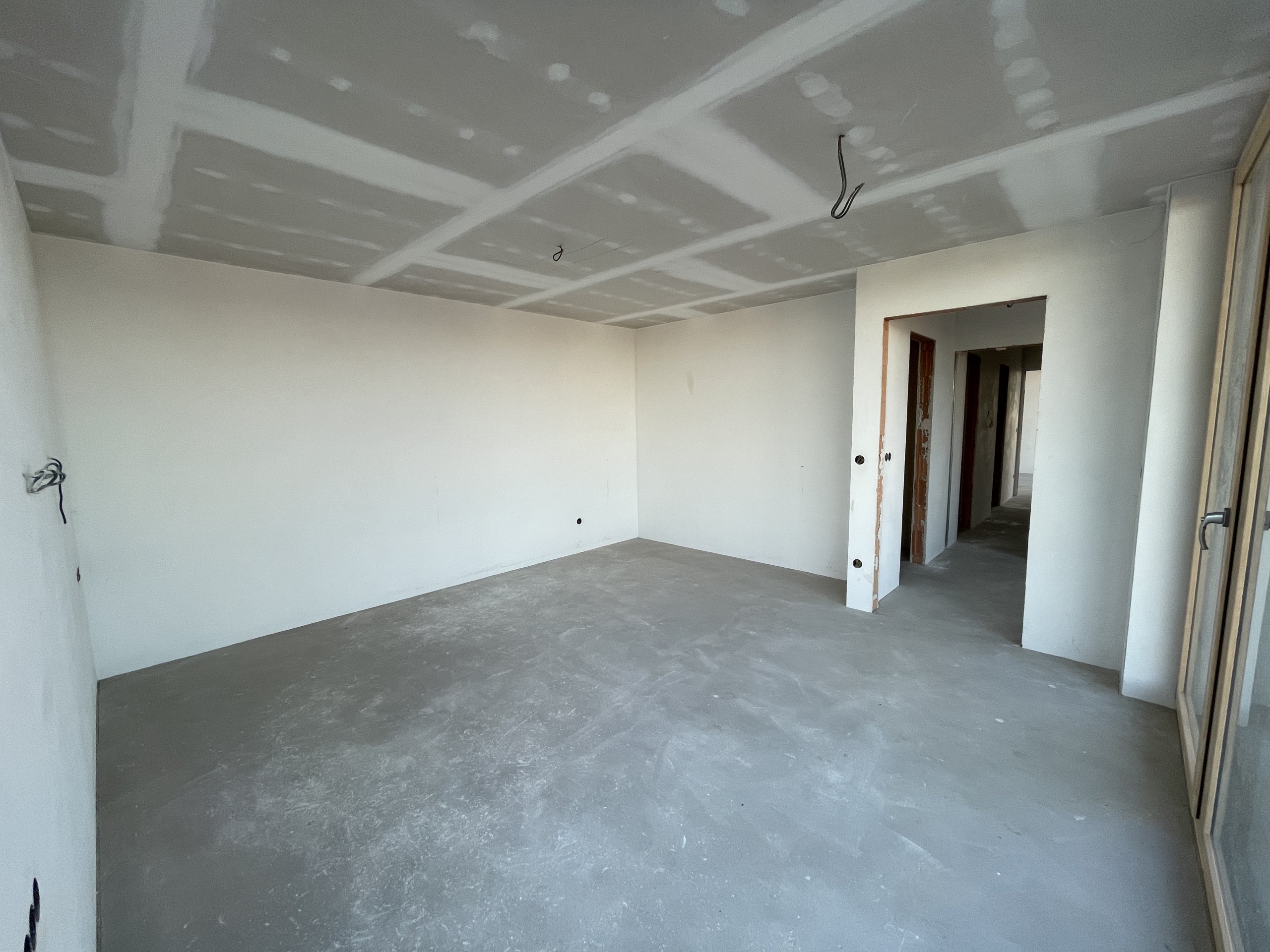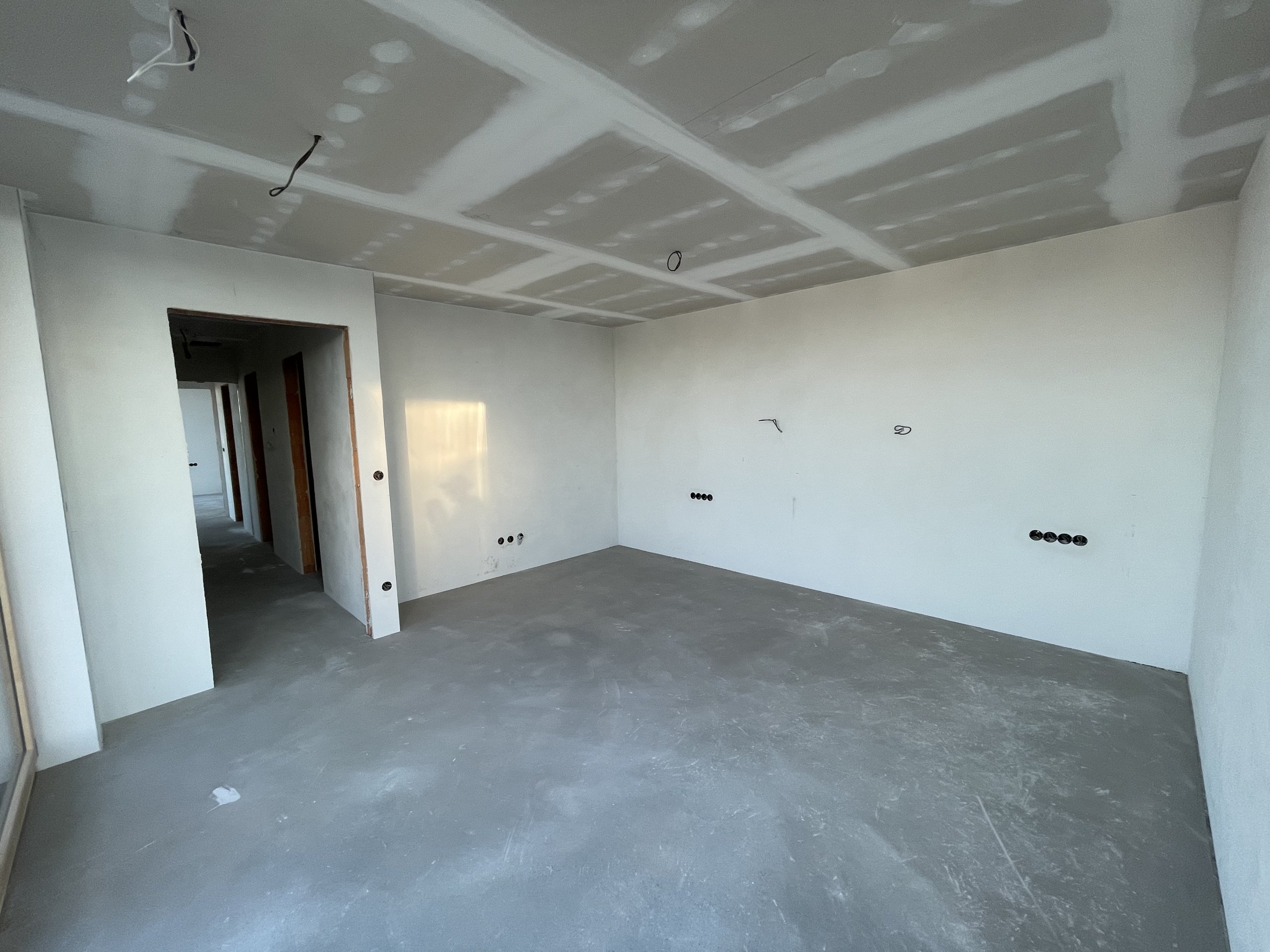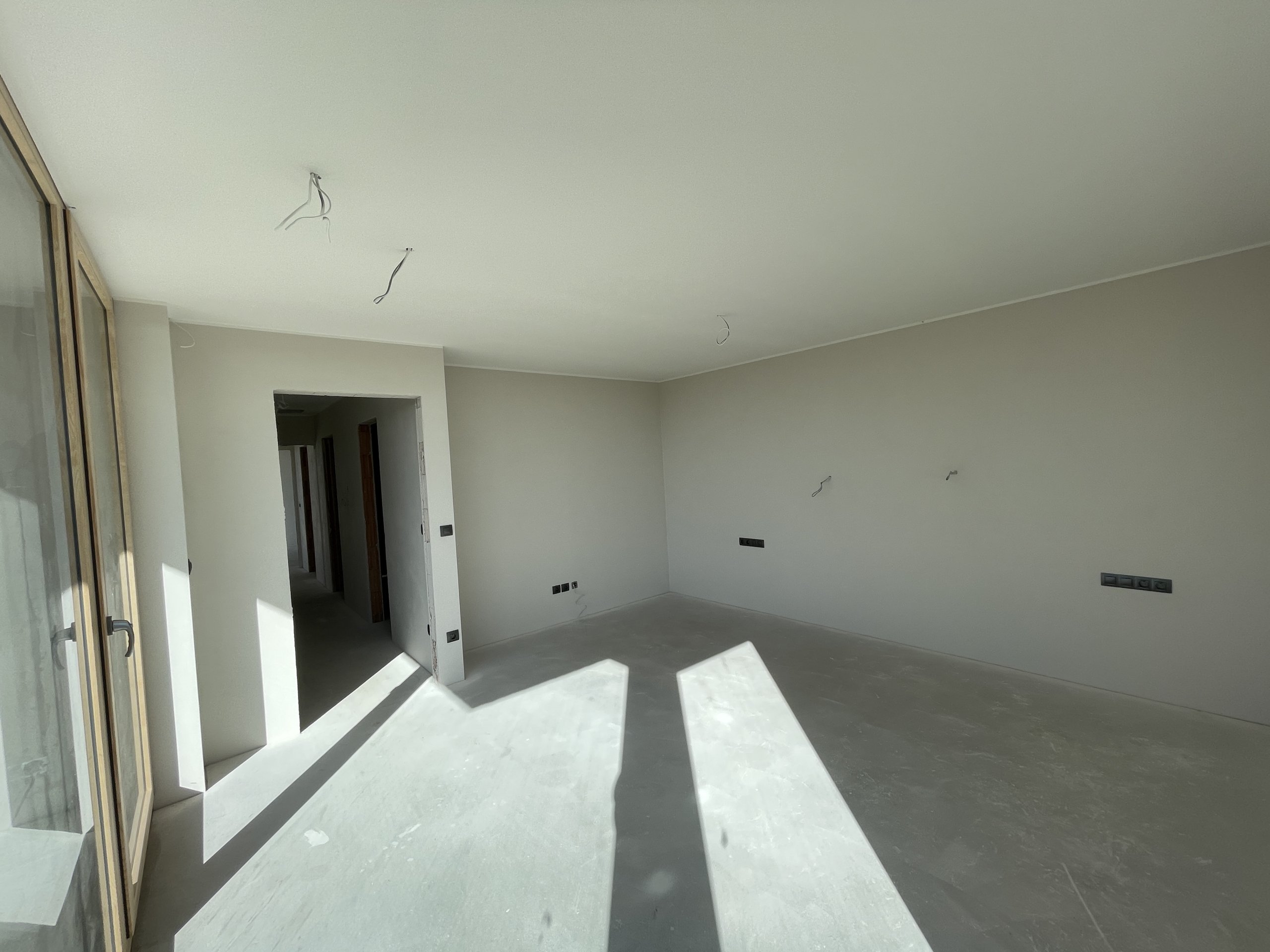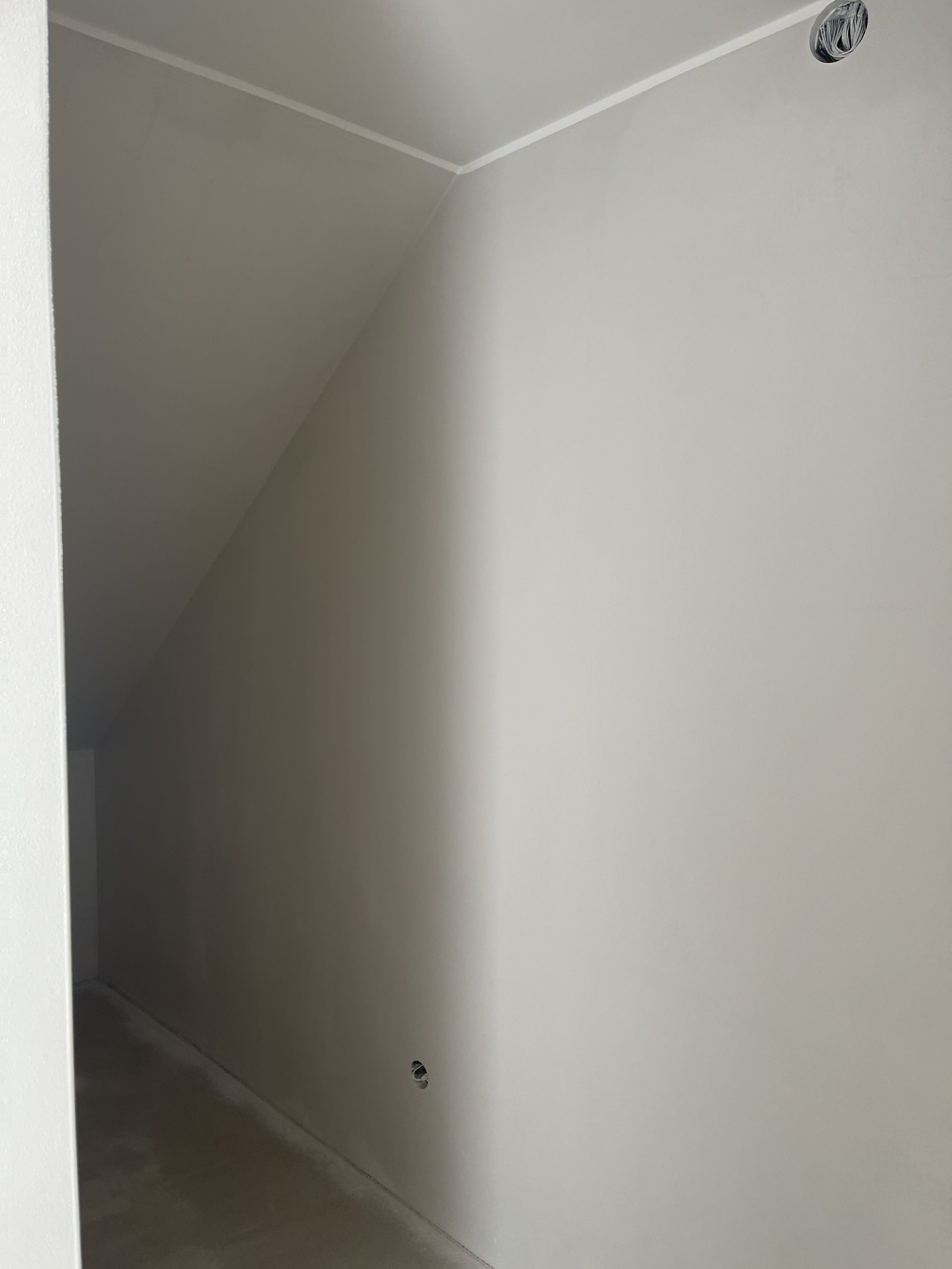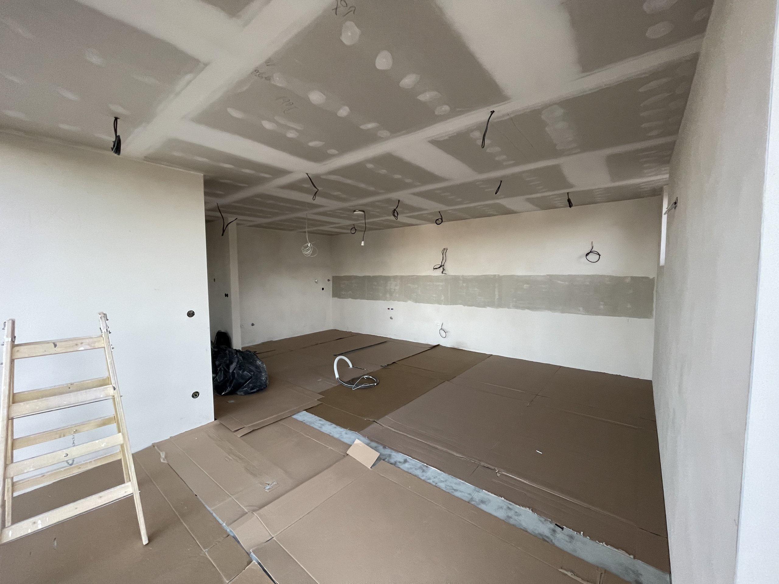 Stropy byly vymalovány bílou barvou Jupol Classic, zatímco stěny dostaly světle hnědo-béžový odstín barvou dodanou zákazníkem (značka Hornbach). Celá výmalba byla provedena Airless stříkací technikou, což zajišťuje rovnoměrný nátěr a rychlé provedení.